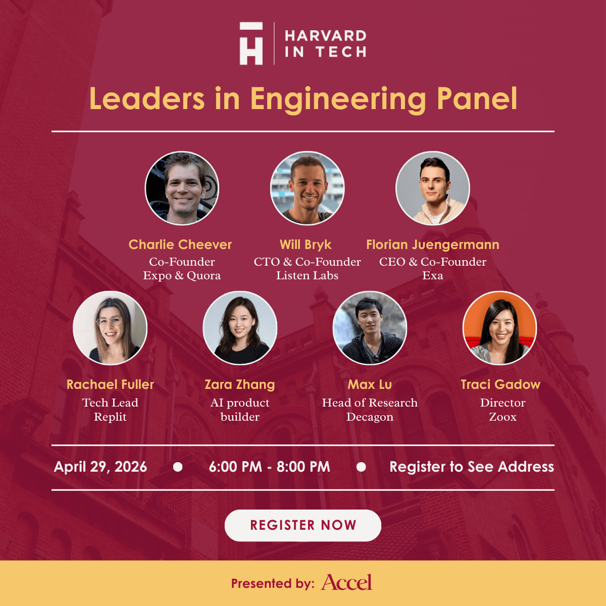 Harvard in Tech is coming to SF and hosting a panel with Accel featuring the below Harvard alums who are top founders and engineering leaders.